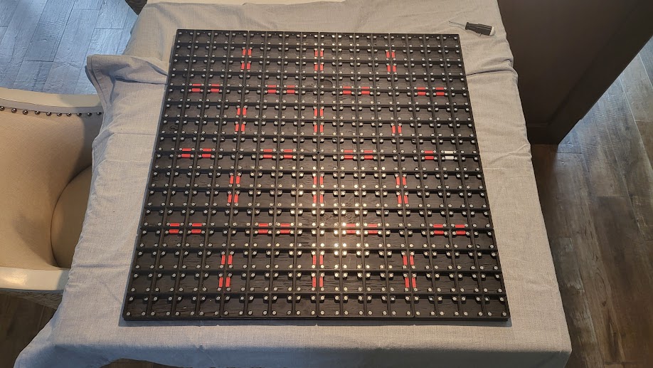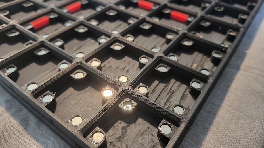 Each pixel spot in the baseplate holds four 6mm x 2mm magnets = 64 magnets per plate = 1024 magnets for the 16×16 grid